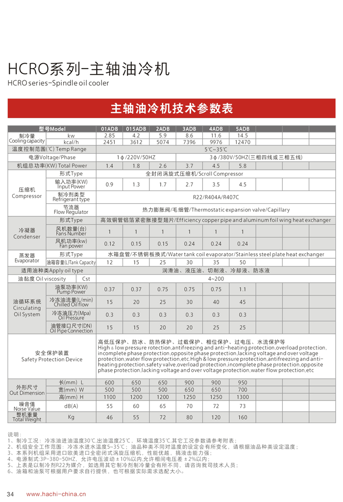 1、制冷能力是在環(huán)境溫度35℃,進(jìn)油溫度35℃,出油溫度30℃,油品為ISO VG32條件下測(cè)得。 2、用戶在選擇油冷機(jī)時(shí),必須選擇油液需控制的溫度范圍(1)18℃-25℃ (2)25℃-35℃ (3)35℃-45℃ (4)45℃以上。本公司推薦液壓油合理的溫度控制范圍為35℃-45℃. 3、本機(jī)組內(nèi)置冷卻油箱,接口可用軟硬管連接,且加裝過濾器。 4、機(jī)組操作面裝有冷卻液油箱液拉顯示裝置,方便快捷查看液位。 5、機(jī)組內(nèi)部裝有油泵,可根據(jù)需要調(diào)節(jié)冷卻液的流量及壓力。 6、機(jī)組采用高精度電子顯示器,內(nèi)置P.I.D自動(dòng)演算功,延時(shí)啟動(dòng)功能。 7、以上機(jī)組使用環(huán)境為5~42℃,42℃以上屬高溫機(jī)組,外形尺寸及相關(guān)參數(shù)會(huì)有所變更,請(qǐng)選型時(shí)注意。 8、參數(shù)表內(nèi)為本公司標(biāo)準(zhǔn)機(jī)型,本公司接受客戶非標(biāo)機(jī)器訂做. 適用種類: ◇ CNC車床、銑床、磨床、拉床 ◇ CNC旋轉(zhuǎn)臺(tái)、油壓機(jī)、木工雕刻機(jī) ◇ CNC立式/臥式加工中心、綜合切削加工中心 ◇ 高速機(jī)械主軸、電主軸、靜壓(動(dòng)靜壓)主軸 ◇ 各種機(jī)械的液壓站及潤滑系統(tǒng) ◇ 放電加工設(shè)備、慢走絲、研磨機(jī)、試驗(yàn)室設(shè)備、激光設(shè)備等..